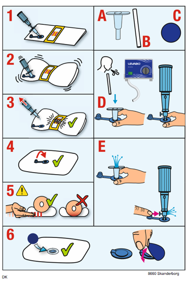 Držte ventil prístroja medzi ukazovákom a palcom (obr. E), vložte malú modrú trysku (obr. A) na uvoľnenie vzduchu.